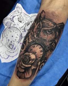 咸先生小臂写实猫头鹰钟表玫瑰纹身图案