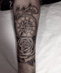 做卖镜子的殷先生小臂写实玫瑰怀表纹身图案